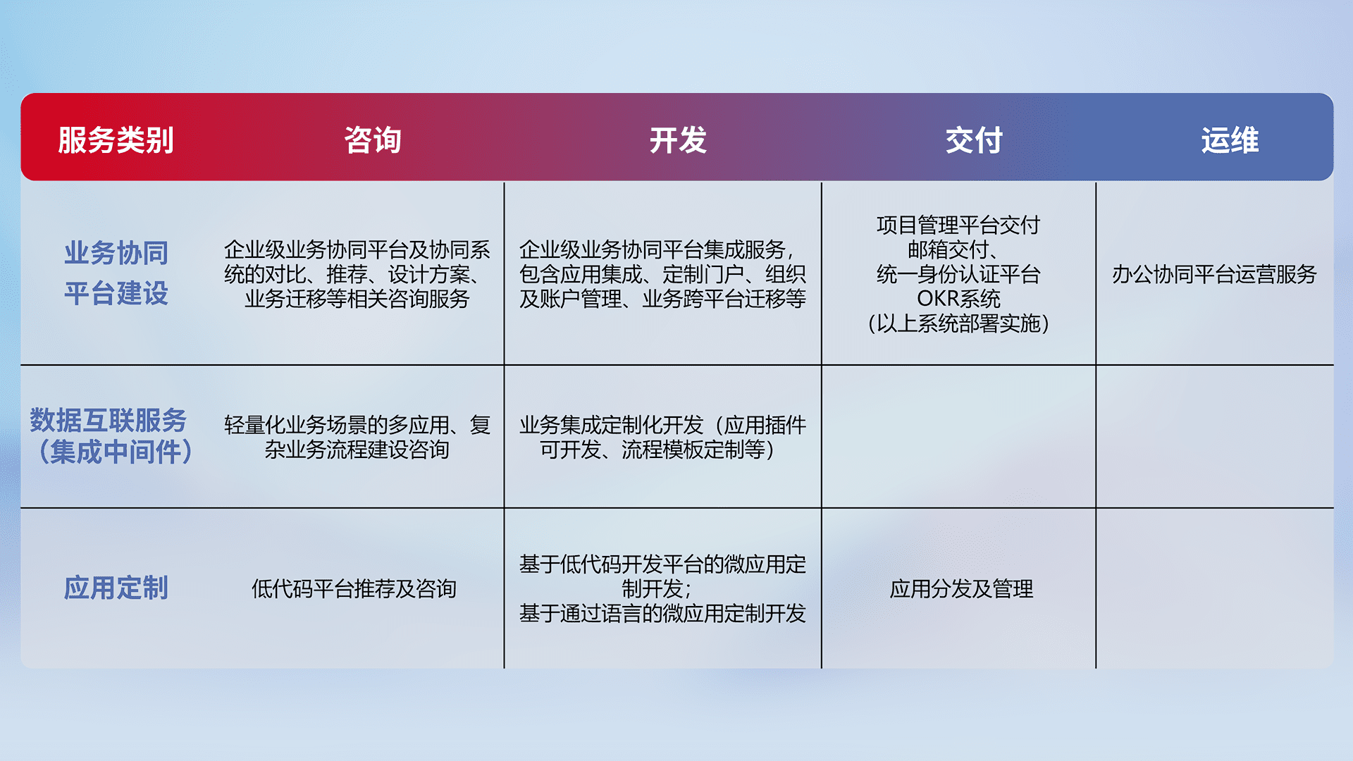 针对钉钉、、、企微、、、、IDaas等平台级产品提供产品的规划、、方案、、交付、、定制化开发等服务,,,,实现如统一协同办公、、、智能客户服务、、、混合会议管理、、智能数据查询、、、、等业务场景,,实现数字化转型。。。